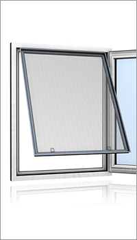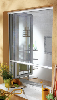 Moustiquaire pour fenêtre normale. La toile est cachée dans un caisson équipé d’un ressort pour la montée et la descente.