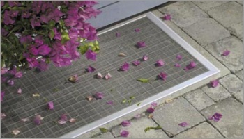 La toile en acier inoxydable robuste est sertie dans le profilé aluminium de la couverture de saut-de-loup. Une brosse assure l’étanchéité avec le sol et le mur de la maison.