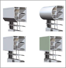 Stores à lamelles avec caisson disponible en trois formes : rond, carré ou angulaire. Store idéal pour la pose en applique ou lors de rénovation. Moustiquaire incorporé dans le caisson sur demande.